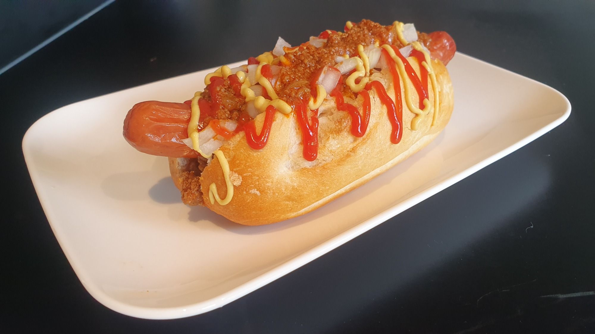 Veggie Hot Dog auf einem warmen Brötchen mit gebratener Paprika & Zwiebel, Käse, Röstzwiebeln, Sriracha Ketchup
